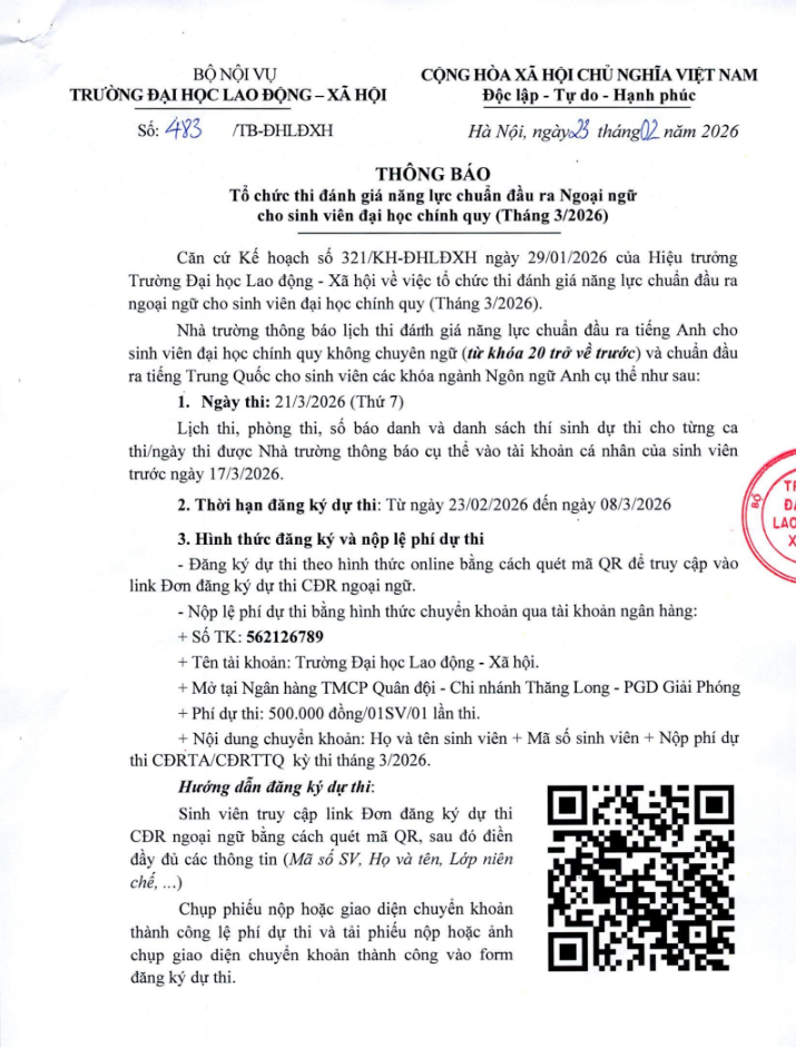 Thông báo lịch thi đánh giá chuẩn đầu ra Tiếng Anh cho sinh viên đại học hệ chính quy (T3.2026)
